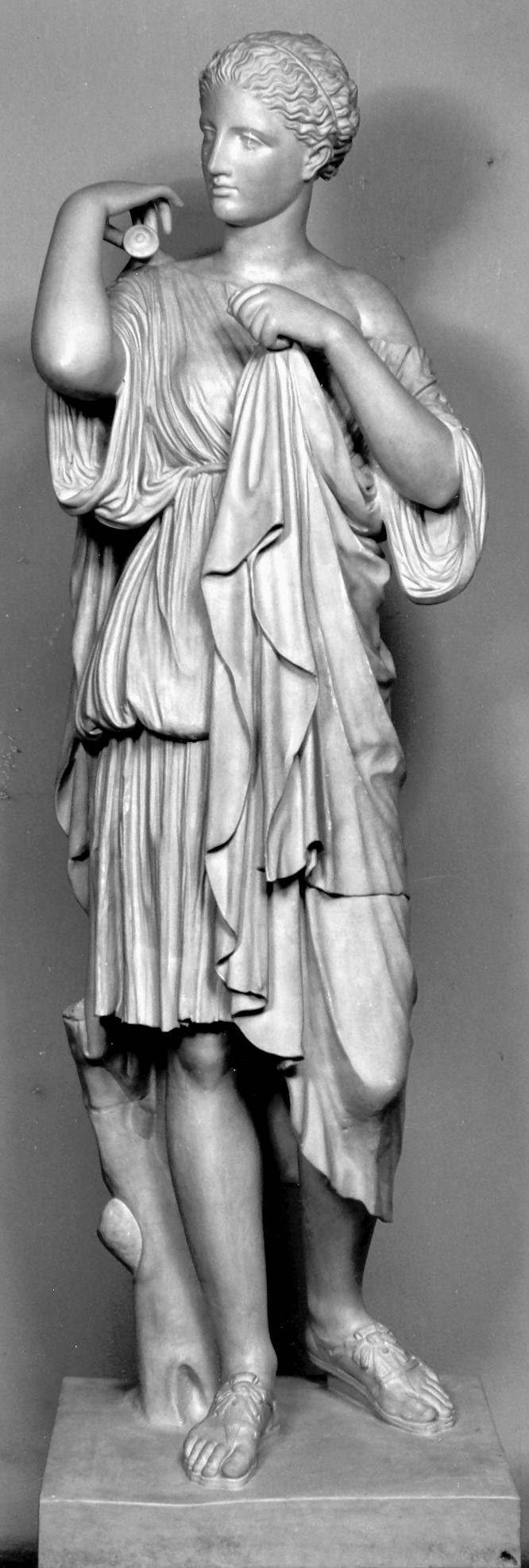 Sie stellt eine schmale, mädchenhafte Gestalt dar, die Jagdkleidung trägt: einen an den Schultern geknüpften, zweifach gerafften, nur knielangen Ärmelchiton sowie einen Mantel. Das Jagdgewand ist in der Antike nur bestimmten weiblichen Figuren des Mythos, nämlich Artemis und den Amazonen, vorbehalten. Die mädchenhafte Bildung der  Dargestellten, die bei einem Vergleich mit den berühmten Amazonenstatuen des 5. Jh.v.Chr. offensichtlich wird und auch die gewisse Schicklichkeitsgrenzen nicht überschreitende Gewanddrapierung - zumindest jeweils eine Brust der zuvor genannten Amazonen ist entblößt - läßt die Benennung unserer Statue als Artemis sicher erscheinen, obwohl weitere für die Göttin typische Attribute fehlen. In der Spannung zwischen der betonten Jugendlichkeit der mädchenhaften Gestalt und ihrem Auftreten als „amazonenhafte“ Jägerin wird eine gewisse Ambivalenz der Aussage dieses Götterbildes deutlich. Hierbei ist jedoch dem mädchenhaften Charakter der Göttin der Vorrang eingeräumt. Die Göttin wird beim Ab- bzw. Anlegen ihres Mantels gezeigt. Das Haltungsmotiv ist kompliziert. Während der erhobene und angewinkelte rechte Arm nach der Mantelschließe über der rechten Schulter greift, hält der linke, vor dem Körper angewinkelte Arm einen der Mantelzipfel vor die Brust. Der Bewegung der Rechten folgt die Wendung des Kopfes. Das ruhige, kontrapostische Standmotiv tritt zur komplizierten Bewegung der Arme und des Kopfes nicht in Konkurrenz.