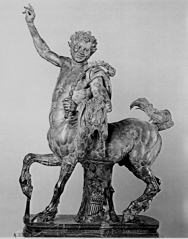 Die Statue eines alten, gefesselten Kentauren ist, neben einigen Kopfrepliken, in zwei mehr oder weniger vollständigen römischen Kopien überliefert. Das eine Stück wurde 1736 von dem späteren Kardinal Alessandro Furietti bei Ausgrabungen in der sog. »Accademia« der Villa Hadriana bei Tivoli gefunden. Es befindet sich heute in den Kapitolinischen Museen in Rom. Die Statue ist in grauschwarzem Bigio morato gearbeitet und auf der Basis von den aus dem kleinasiatischen Aphrodisias stammenden Kopisten Aristeas und Papias signiert. Die Figur wurde vermutlich speziell für die Ausstattung der Villa Hadriana geschaffen und ist in späthadrianische Zeit zu datieren. Eine weitere Replik dieses Typus, der sogenannte »Kentaur Borghese« kam bereits Anfang des 17. Jhs. bei Ausgrabungen auf dem Caelius zu Tage, wo die aus weißem Marmor gefertigte Statue, die wohl in flavischer Zeit entstanden ist, eine der reichen Vorstadtvillen Roms schmückte. Die Skulptur gelangte bald nach der Auffindung in die Sammlung Borghese, die später nach Paris überführt wurde.