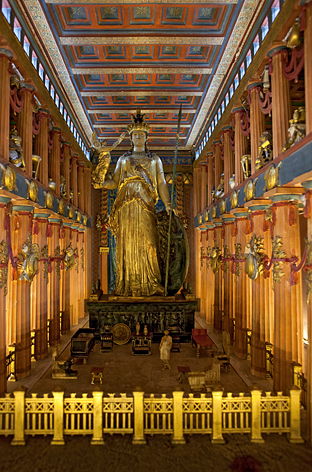 Die Rekonstruktion der Architektur des Parthenon beruht auf den archäologischen Befunden der Zeit. Für die hypäthrale Dachkonstruktion richtete man sich nach der Studie von Charles Chipiez des Jahres 1878 in der Revue Archeologique. Zur weiteren Rekonstruktion wurden verschiedene Quellen herangezogen. Die Giebelskulpturen beruhen unter anderem auf Zeichnungen, des Zeichners Carrey des Jahres 1674, sowie der Darstellung eines Puteals in Madrid. Für das Kultbild wurden die Athena Lemnia des Phidias und die Farbrekonstruktion von Charles Simart herangezogen. Die im Jahr 1880 gefunden Varvakion-Statuette, eine verkleinerte Kopie der Athena Parthenos, wurde nicht berücksichtigt.